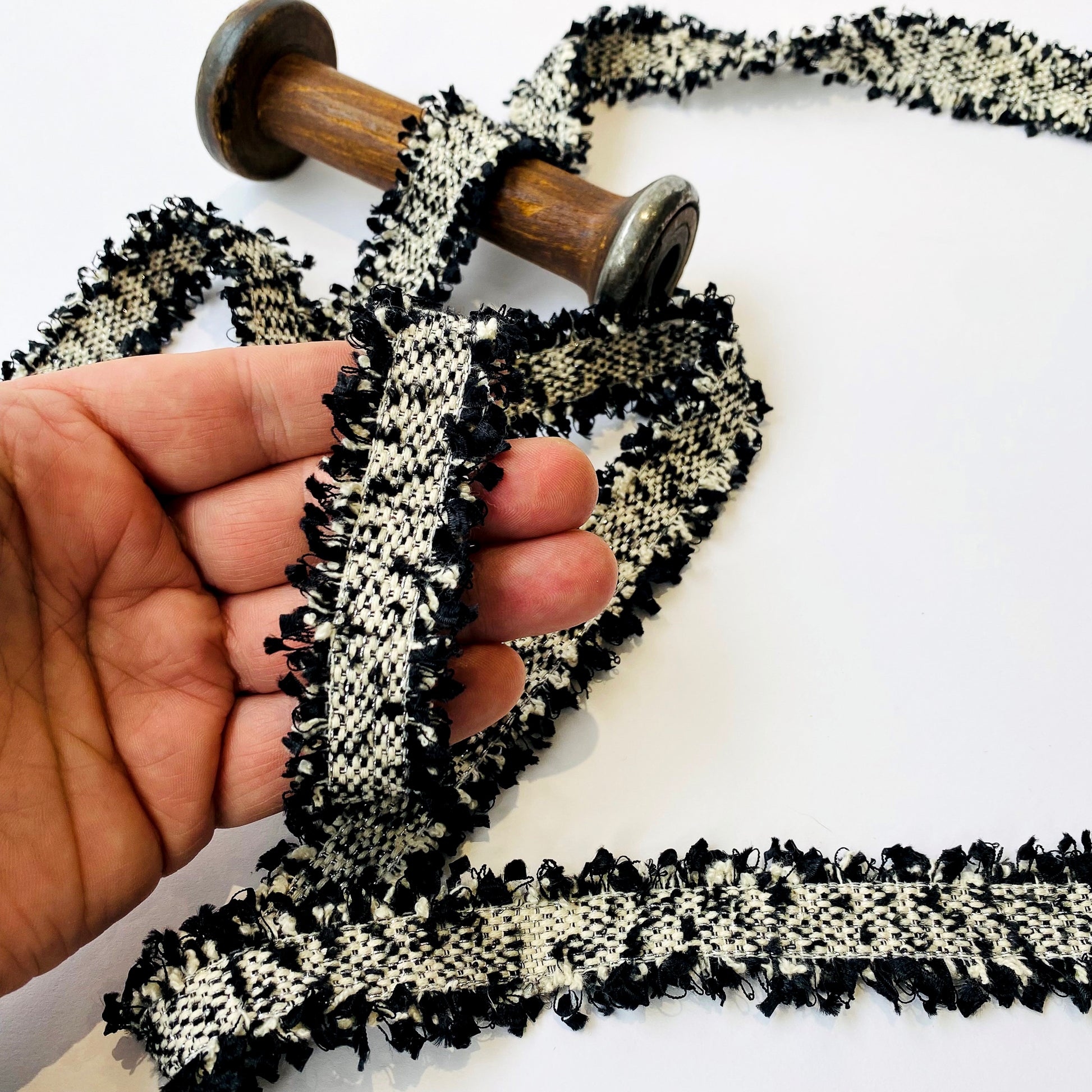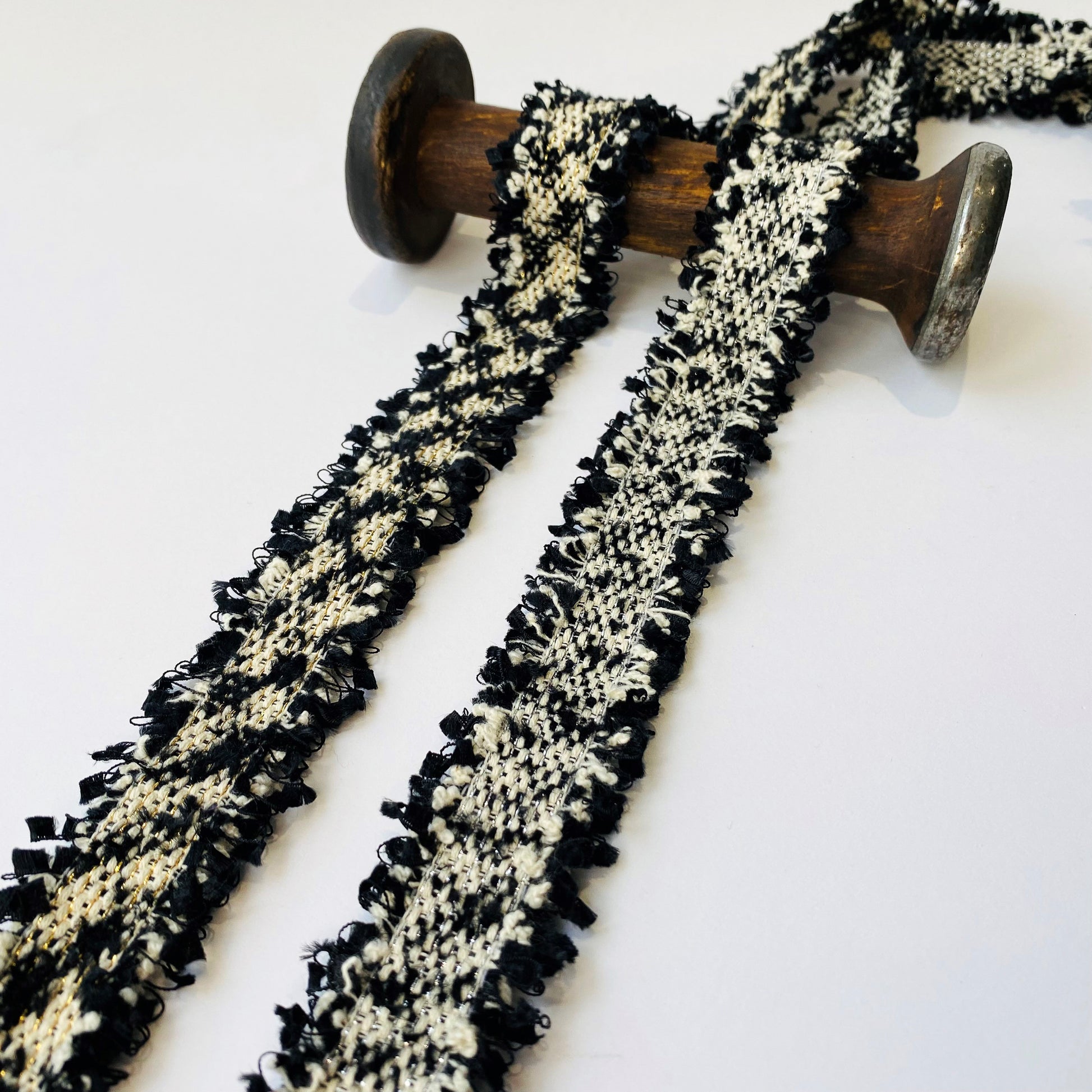 Trenza de tweed tejida maravillosamente suave con sutiles motas de brillo plateadas u doradas. Añade un toque genuino de glamour y sofisticación estilo Chanel a cualquier prenda.