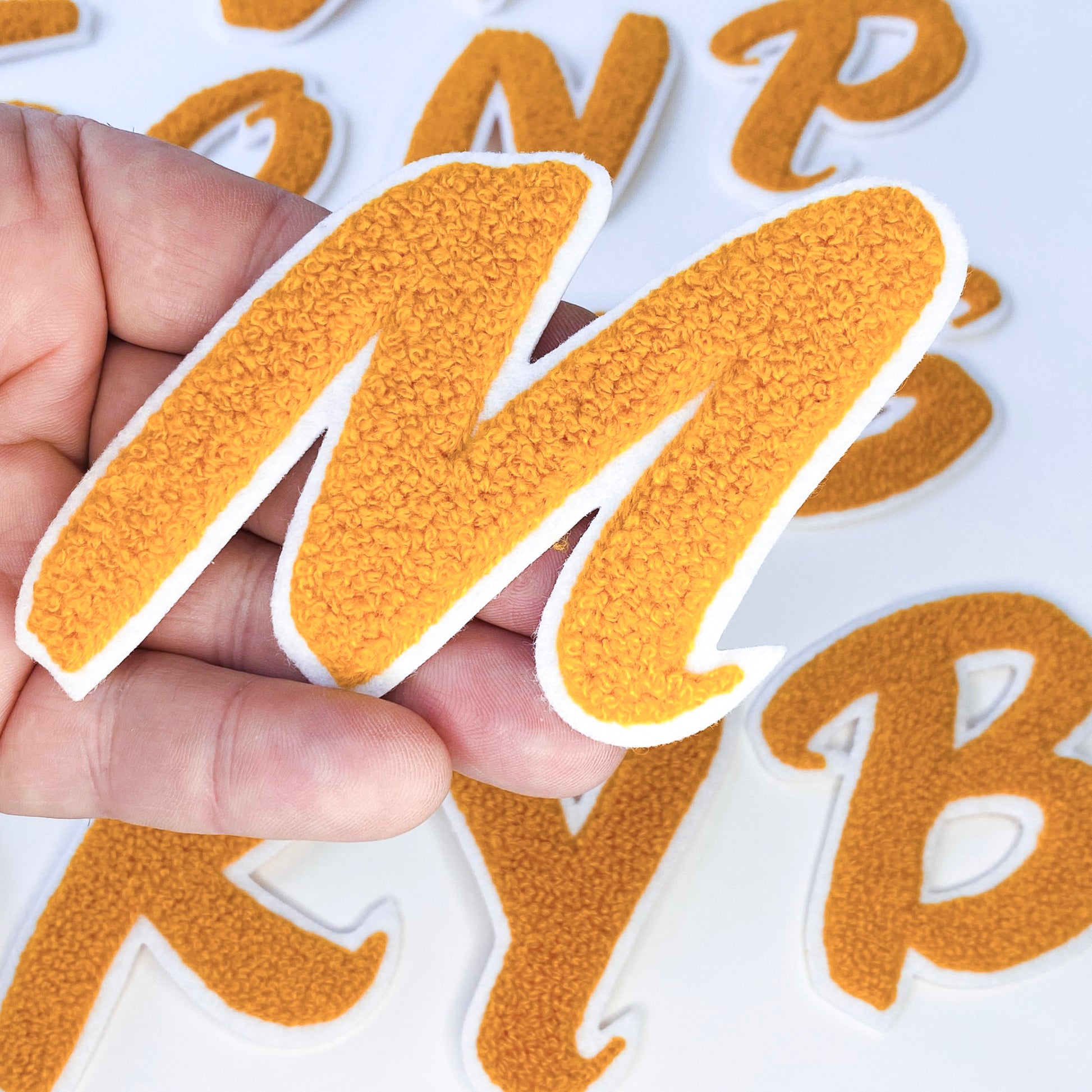 Letras de parche para planchar de chenilla dorada de 9 cm