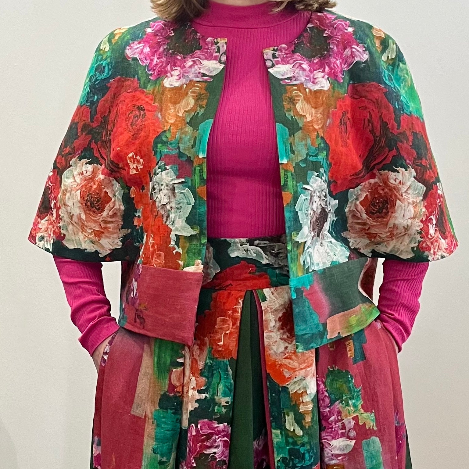 Ludo: a modern cape for the modern maker. With a strong sculpted, silhouette and minimalist styling, consider Ludo as your blank canvas. Striking in a plain cloth, at ease with a bold print, or as the perfect base to explore surface decoration and create a unique and iconic garment to reflect your personality.